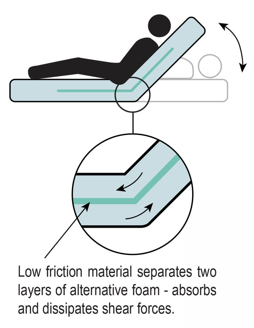- 360 degrees of movement offering reduction of shear in all directions, essential when reducing the risk of skin breakdown related to shear forces
